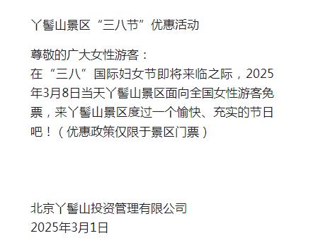 2025年3月8日當(dāng)天丫髻山景區(qū)面向全國(guó)女性游客免票(優(yōu)惠政策僅限于景區(qū)門票)