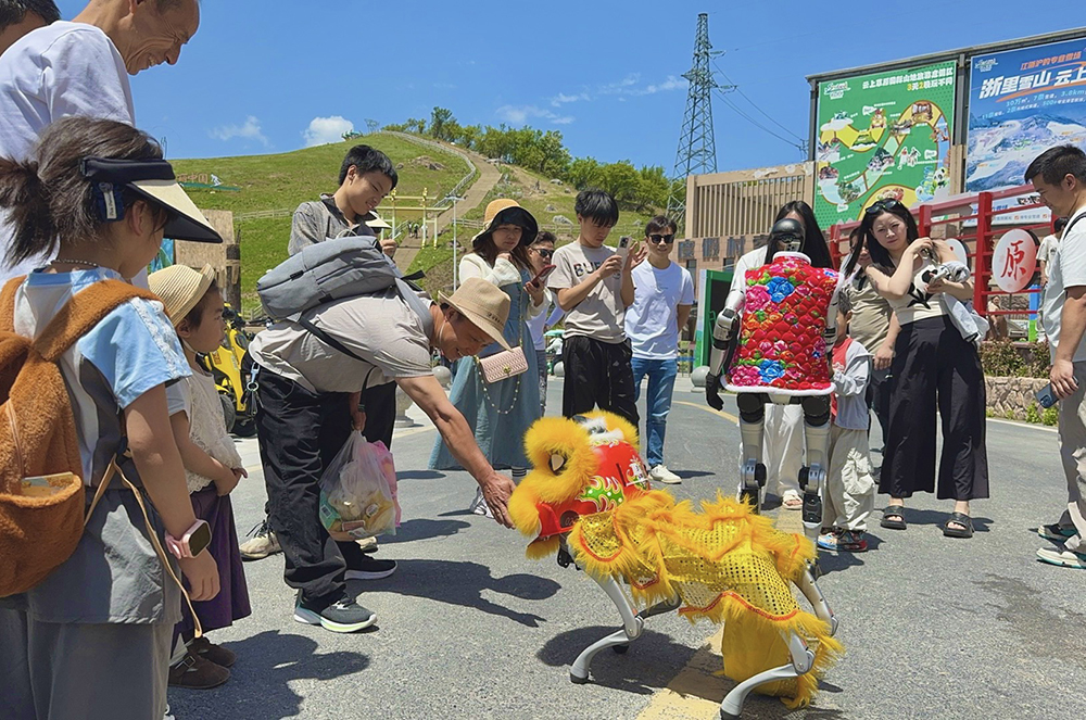 宇樹機器人與機器狗戰(zhàn)隊正在草坪上“營業(yè)”,科技感十足的巡游表演吸引大批游客圍觀。萌寵機器人不僅能隨音樂蹦迪,還能與小朋友擊掌互動,現場歡笑聲不斷。