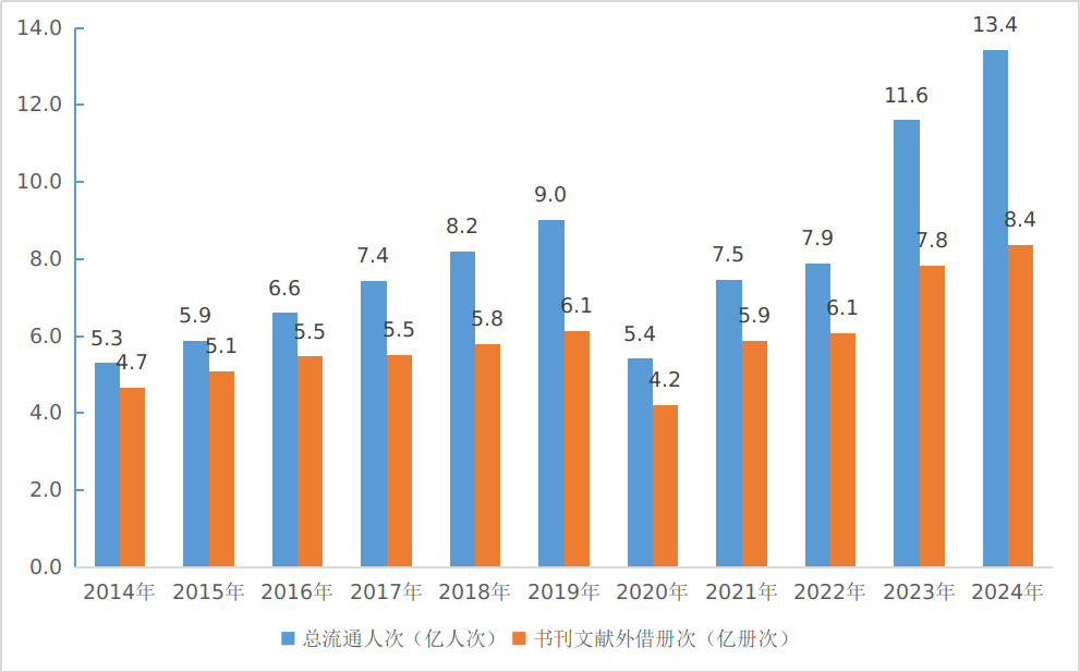 圖2:2014—2024年全國(guó)公共圖書(shū)館總流通人次及書(shū)刊外借冊(cè)次
