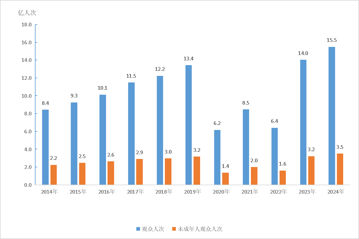 圖4:2014—2024年全國(guó)文物機(jī)構(gòu)接待觀(guān)眾人次及未成年人觀(guān)眾人次