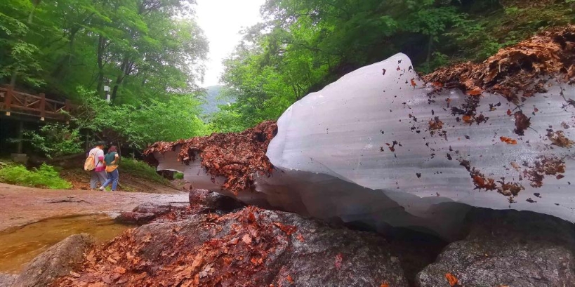 景區(qū)工作人員介紹,大冰溝森林公園地處中溫帶低海拔地區(qū),屬峽谷地貌,冬天山泉凍結(jié)成厚厚的冰蓋,第二年8月才會(huì)完全消融,形成了夏季“冰瀑”奇觀。游客行走在森林公園中,不禁為“左手盛夏右手冬”的奇妙體驗(yàn)折服。