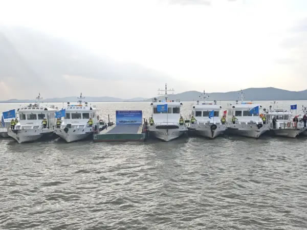 本次演練以“實(shí)戰(zhàn)導(dǎo)向、效果為先”為原則,模擬船舶碰撞、人員落水等極端場(chǎng)景,共分為旅游船舶開航前自查、旅游船舶環(huán)太湖聯(lián)動(dòng)動(dòng)態(tài)監(jiān)測(cè)、極端天氣旅游船舶應(yīng)對(duì)處置、旅游船舶險(xiǎn)情處置、人員落水應(yīng)急處置5個(gè)科目。其中,旅游船舶開航前自查科目中,對(duì)照《中國(guó)籍船舶開航前自查清單》嚴(yán)格開展自查工作,確保船舶適航、人員適配,保證航行安全。環(huán)太湖旅游船舶聯(lián)動(dòng)動(dòng)態(tài)監(jiān)測(cè)科目驗(yàn)證了現(xiàn)有監(jiān)控系統(tǒng)對(duì)湖區(qū)船舶的精準(zhǔn)感知與實(shí)時(shí)管控能力,檢驗(yàn)了跨區(qū)域多部門協(xié)同響應(yīng)機(jī)制的可行性與高效性。極端天氣旅游船舶應(yīng)對(duì)處置科目模擬旅游船舶航行途中遭遇極端天氣,“蘇交執(zhí)法錫039”輪、“湖州執(zhí)法艇浙交巡0328”輪迅速進(jìn)入伴航狀態(tài),與游船配合形成“兩艇護(hù)一船”的防護(hù)陣形,全程護(hù)航,實(shí)時(shí)監(jiān)測(cè)周邊水域動(dòng)態(tài)、規(guī)避潛在風(fēng)險(xiǎn),主動(dòng)提供必要的航行協(xié)助。旅游船舶險(xiǎn)情處置科目充分展示旅游船舶在航行過程中突發(fā)極端天氣的全過程應(yīng)對(duì)處置,包括預(yù)警接收、封航、應(yīng)急避險(xiǎn)、協(xié)同數(shù)援、人員轉(zhuǎn)運(yùn)。人員落水應(yīng)急處置科目中,應(yīng)用無人機(jī)、遙控救生機(jī)器人新型智能裝備與數(shù)字化技術(shù),為最大限度挽救生命提供堅(jiān)實(shí)保障。