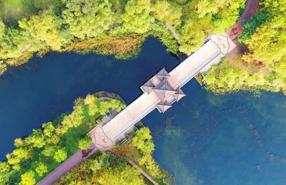 10月25日拍攝的臨汾市汾河文化生態(tài)景區(qū)。景區(qū)內(nèi)波光粼粼,水草搖曳,疊翠流金。近年來,當?shù)赝ㄟ^建設城市公園,綠化美化城市空間,實現(xiàn)開門見綠、推窗見景。(記者 李現(xiàn)。