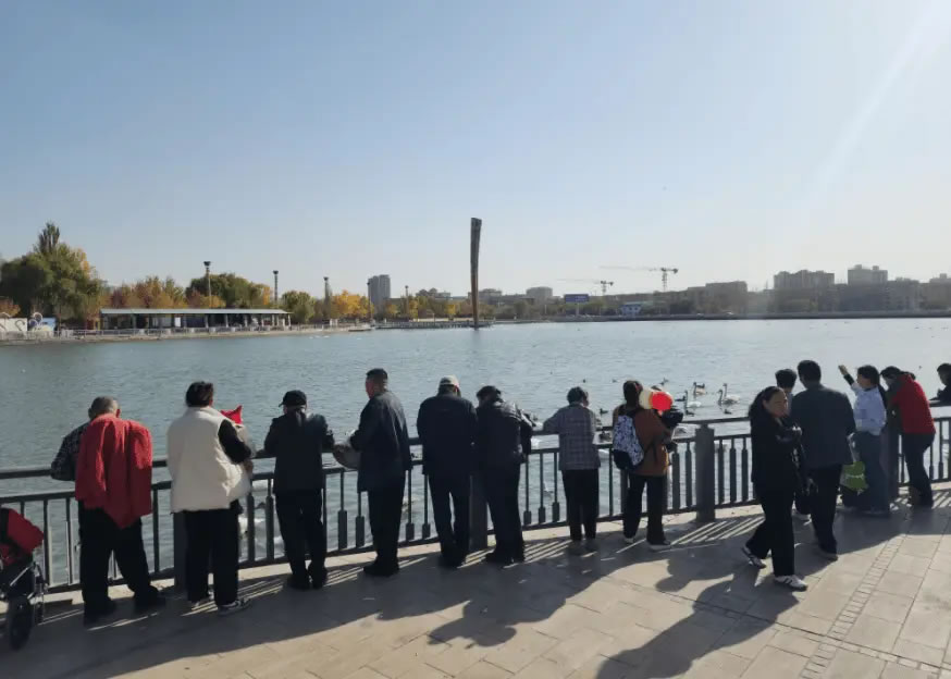 10月28日,在杜鵑河彭加木雕像水域附近,成群的天鵝和野鴨等鳥(niǎo)類在河面上游弋、嬉戲,潔白的天鵝與碧水、藍(lán)天、樓宇相映成趣,美輪美奐,吸引了不少市民和游客駐足欣賞,構(gòu)成一幅自然和諧的生動(dòng)畫卷。重慶游客張清揚(yáng)說(shuō):“第一次來(lái)到庫(kù)爾勒,看到美麗的天鵝,心情都被治愈了,這是大自然的饋贈(zèng),庫(kù)爾勒的自然環(huán)境好,才會(huì)吸引這么多天鵝來(lái)這里過(guò)冬。”