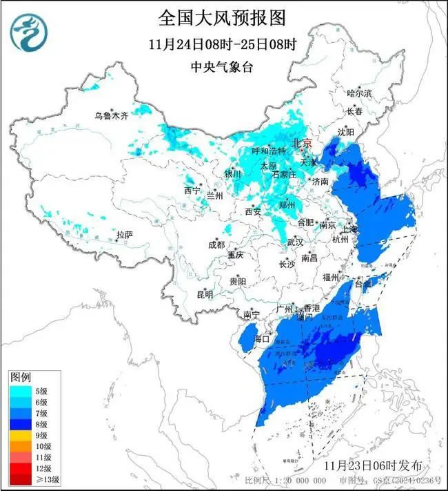 11月24日08時(shí)至25日08時(shí),內(nèi)蒙古中西部、甘肅北部、青海東北部、西北地區(qū)東部、華北等地的部分地區(qū)有5~7級大風(fēng),陣風(fēng)8~9級,黃淮北部和西部、江漢等地的部分地區(qū)有5~6級大風(fēng),局部地區(qū)陣風(fēng)7~8級;渤海、黃海中部和南部局地、南海北部和中部海域?qū)⒂?~8級、陣風(fēng)9~10級的大風(fēng)。