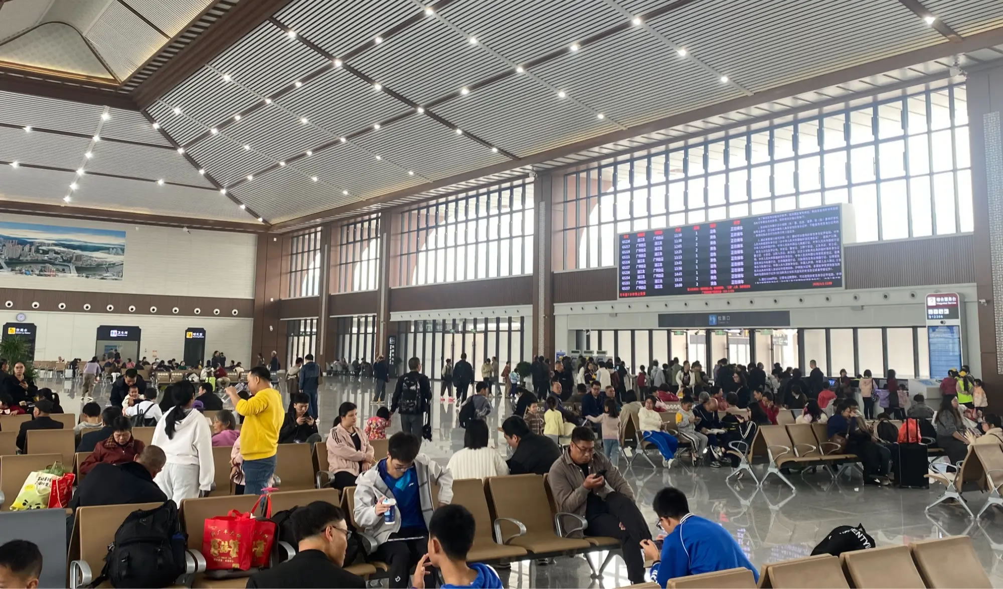 上午的候車大廳內(nèi),客流較平日明顯增多。旅客在志愿者和工作人員的引導(dǎo)下有序候車,安檢口雖排起隊伍,但通行速度較快,廣播循環(huán)播放著安全提示和車次信息,整體氛圍忙而不亂。