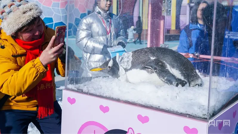 游客與企鵝互動打卡(央廣網(wǎng)發(fā) 大連圣亞海洋世界供圖)