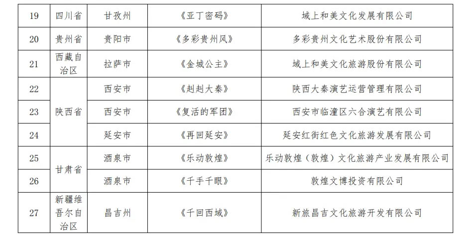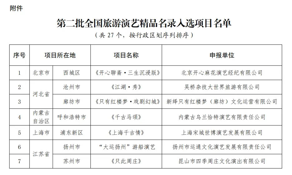 央廣網(wǎng)北京1月16日消息(記者 宋雪)文化和旅游部辦公廳近日發(fā)布通知,公布第二批全國旅游演藝精品名錄入選項目名單,《只有紅樓夢·戲劇幻城》《赳赳大秦》《樂動敦煌》等27個項目入選。