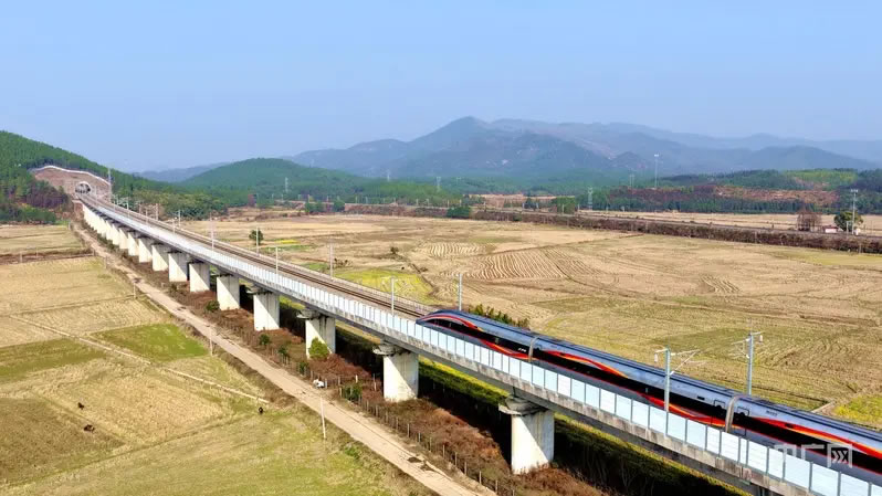 列車(chē)穿梭于田野山巒之間,構(gòu)成一幅生動(dòng)的高鐵春運(yùn)圖景 (央廣網(wǎng)發(fā) 宋靖輝 攝)