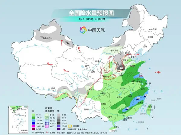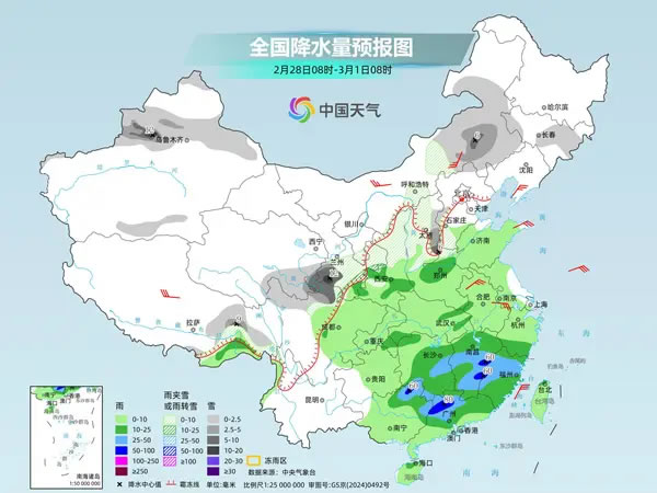 后天,內(nèi)蒙古中東部、新疆北部、甘肅東部、陜西北部、華北中南部、黃淮北部等地部分地區(qū)有小到中雪或雨夾雪,其中,山西南部、河北南部、河南北部等地部分地區(qū)有大到暴雪。黃淮大部、江淮大部、江南中東部和南部、華南北部等地部分地區(qū)有中到大雨,其中,浙江南部、福建西北部、廣東北部等地局地有暴雨。