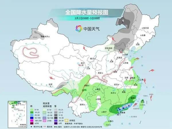 今明天(3月1日至2日),我國(guó)雨雪范圍較大,北方多地將現(xiàn)較強(qiáng)降雪,江南、華南降雨頻繁,部分地區(qū)仍有中到大雨,局地暴雨,公眾出行請(qǐng)留意交通安全。受雨雪和冷空氣影響,北方多地未來幾天最高氣溫將持續(xù)偏低,華北等地體感陰冷,需注意保暖。