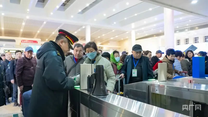 呼和浩特東站客運(yùn)人員服務(wù)游客檢票進(jìn)站(央廣網(wǎng)發(fā) 楊頤 攝)