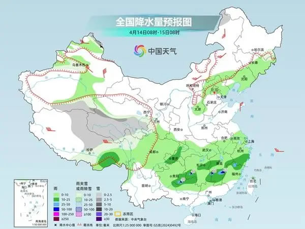 昨天,南方仍有大范圍降雨,同時(shí)青藏高原多地出現(xiàn)降雪天氣。監(jiān)測(cè)顯示,昨天8時(shí)至今天6時(shí),湖南南部、江西南部、福建西北部等地部分地區(qū)出現(xiàn)中到大雨,湖南衡陽(yáng)、江西贛州等局地大暴雨;青海北部和東部、西藏東部、川西高原等地部分地區(qū)出現(xiàn)中到大雪或雨夾雪,四川甘孜局地暴雪。