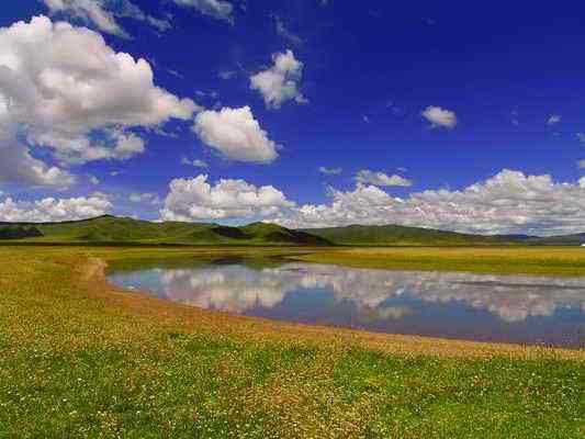 金銀灘的黃金季節(jié)是7、8、9三個月,鮮花盛開,百鳥飛翔,尤其是百靈鳥兒的歌聲,動聽迷人。這里是一片碧草如茵的大草原。浮云般的羊群,棕黑相間的牦牛,星星點點地徜徉在青草和野花叢中。穿著藏服的藏民,騎著駿馬悠然地在草原上緩緩而來。遠(yuǎn)處,山巒起伏,偶有雄鷹飛過的身影,蓮花般的蒙古包散落在白云深處。金銀灘草原牧草肥美、牛羊肥壯,人們以金銀遍地來形容這片美麗而富饒的土地,故得名“金銀灘”。