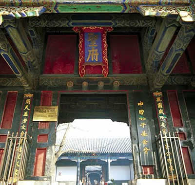 孔府位于曲阜城的中心,坐北朝南,迎面是一個(gè)粉白的大照壁,門(mén)前左右兩側(cè),有一對(duì)2米多高的圓雕雌雄石獅。紅邊黑漆的大門(mén)上鑲嵌著狻猊鋪首,大門(mén)正中上方的高懸著藍(lán)底金字的“圣府”匾額,門(mén)兩旁明柱上,懸掛著一對(duì)藍(lán)底金字對(duì)聯(lián):與國(guó)咸休安富尊榮公府第,同天并老文章道德圣人家。這副對(duì)聯(lián)相傳是清人紀(jì)均的手書(shū)。文佳字美,形象地說(shuō)明了孔府在封建社會(huì)中的顯赫地位。這副對(duì)聯(lián)口氣之大自不待言,發(fā)人深思的是上聯(lián)“安富尊榮”的富字,下聯(lián)“文章道德”的章字,從上圖可以看出,“富”字上少了一 點(diǎn),“章”字中多了一筆,意思是說(shuō)衍圣公官職位列一品,田地萬(wàn)