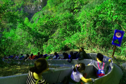 滑道自高門洞起,至空中玻璃漂流入口處止,長約千米。此處山坡陡斜,樹木茂密,滑道從樹叢中順山勢蜿蜒而下,看似蟒行山間草叢中。其中有八個急彎,落差較大,乘坐滑道飛速從山頂滑至山腰,驚險刺激,樂趣無窮。