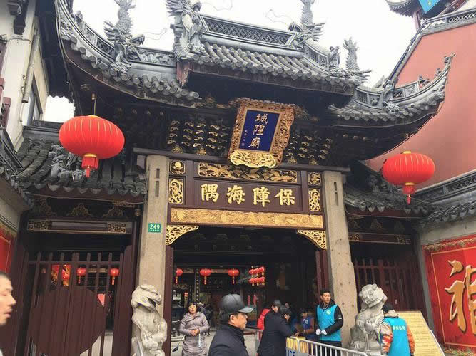 山門,是廟觀的大門,在明朝嘉靖十四年(1535年)建造的,已經有四百五十年以上的歷史了。山門的柱子是石柱,山門的橫梁是木材制作的。上面有四個金色大字“保障海隅”,原來是由明代上?h知縣馮彬題寫的,F(xiàn)在的字是在1994年上海城隍廟恢復開放的時候,根據歷史照片重新書寫的。山門前面有二個石獅子。