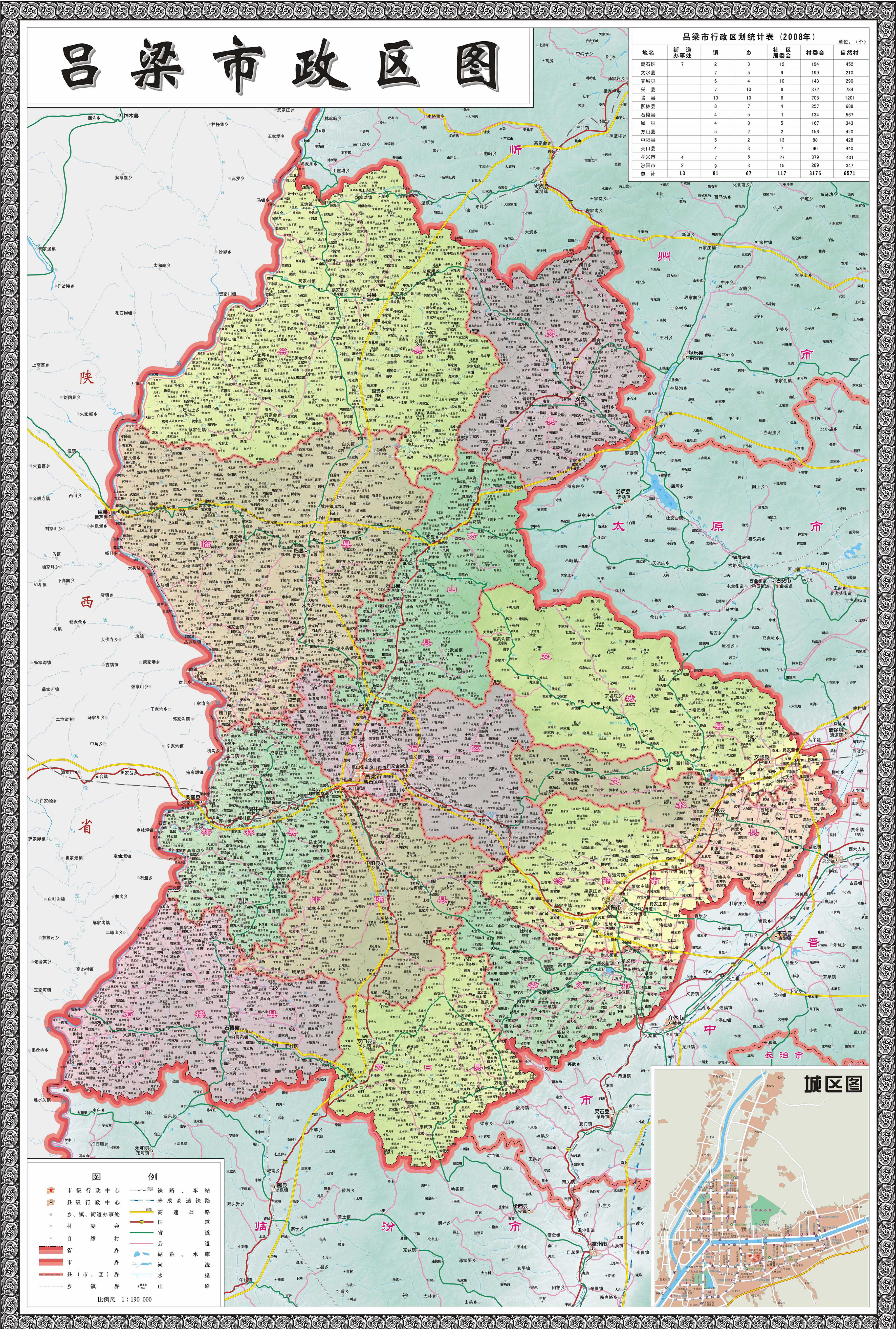 呂梁市轄1個(gè)市轄區(qū)、10個(gè)縣,代管2個(gè)縣級(jí)市: