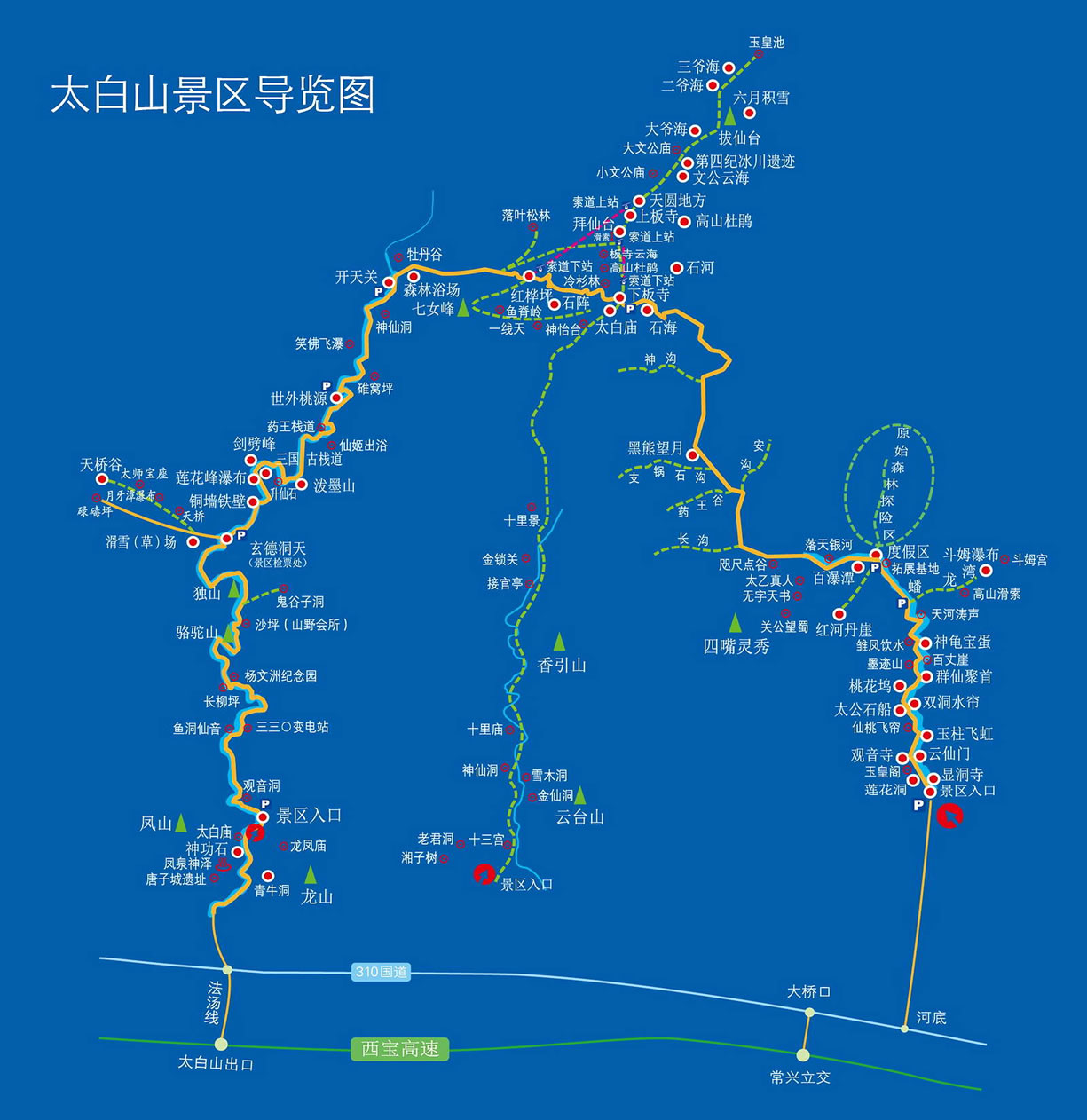 太白國家森林公園以園內(nèi)40公里旅游公路和28公里人行旅游步道聯(lián)結(jié)公園八個景區(qū)140多個景物景點(diǎn),其主要的景區(qū)景點(diǎn)有: