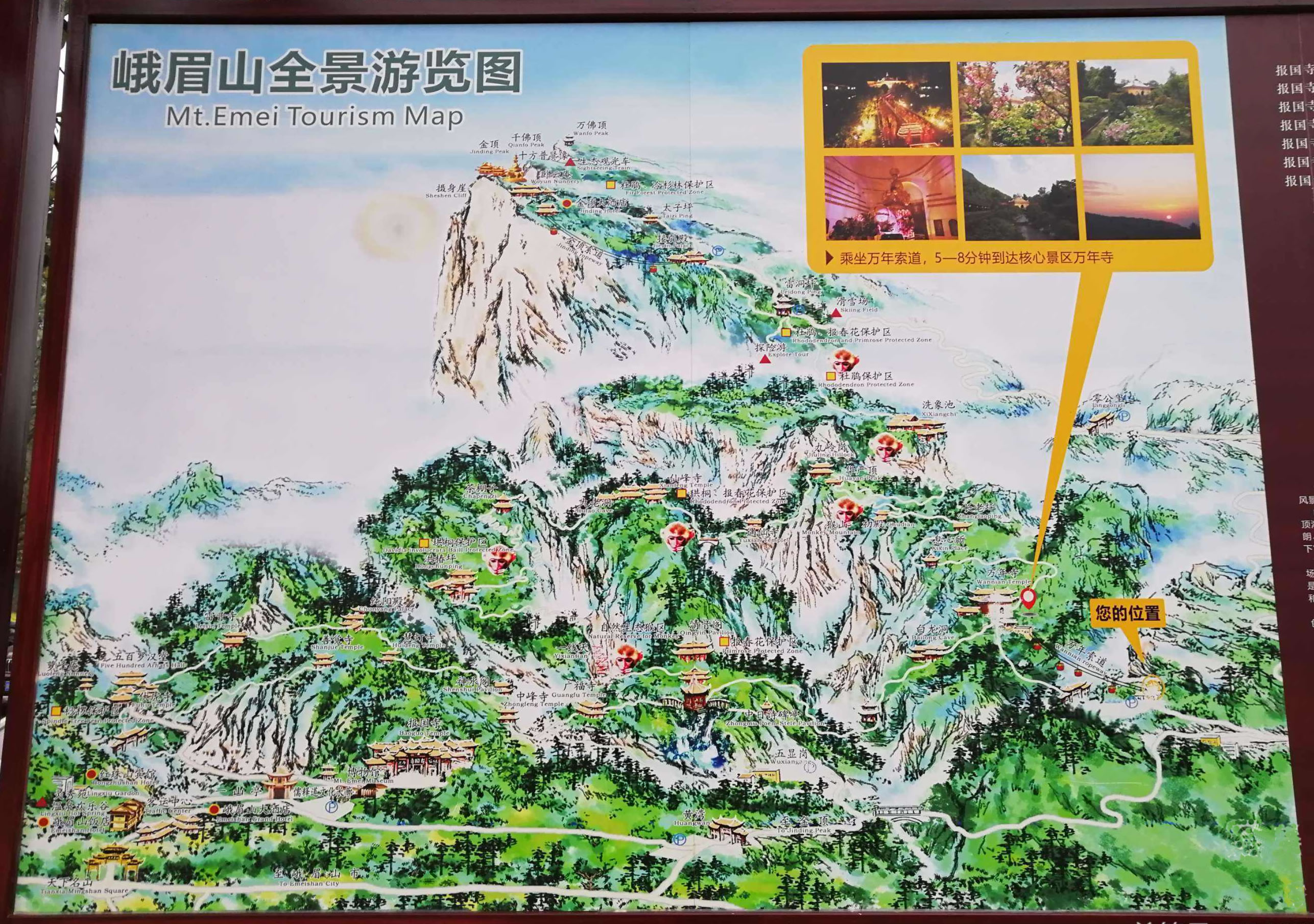 峨眉山原有大小寺院百余處,幾經(jīng)興廢,現(xiàn)存主要寺院有萬年寺、報(bào)國寺、伏虎寺、善覺寺、光相寺。