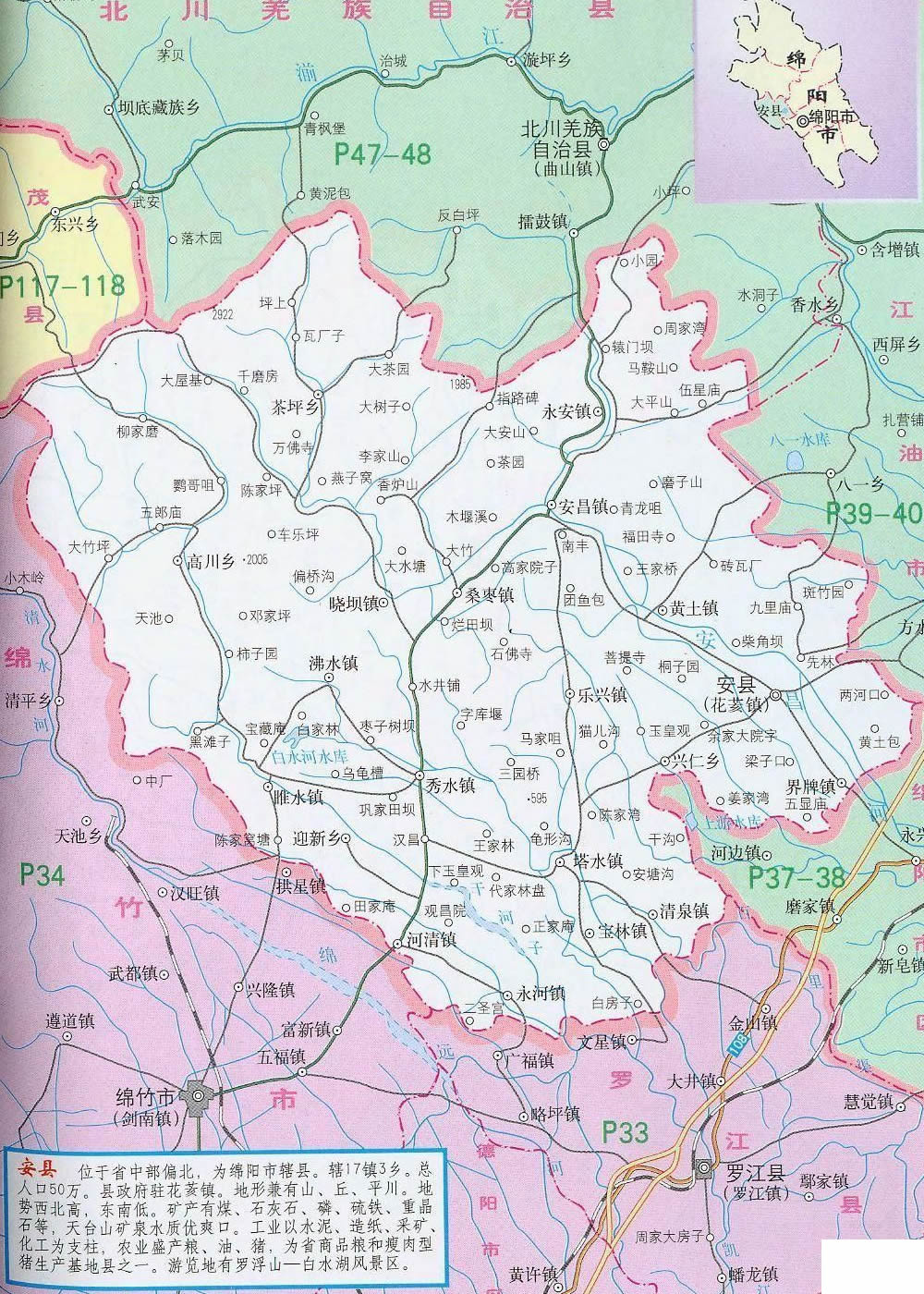 安縣位于四川盆地西北部,距成都110公里,距綿陽科技城10公里。縣境山丘壩兼有,幅員1404平方公里??cè)丝?0萬人,轄4鄉(xiāng)16鎮(zhèn)。安縣氣候宜人,生態(tài)環(huán)境優(yōu)美。屬亞熱帶濕潤季風氣候,氣候溫和,雨量充沛,四季分明,日照充足,無霜期長。年均氣溫16.3℃,年均降水量1260mm,空氣質(zhì)量常年達國家二級標準,森林覆蓋率達42%?h內(nèi)交通四通八達,人流、物流進出快捷方便 ,現(xiàn)代通訊覆蓋全縣,并開通了ADSL業(yè)務和高速寬帶網(wǎng)絡(luò),光纖有線電視遍布城鄉(xiāng)。自然資源豐富,有水泥石灰石、磷礦、煤、硫鐵礦、重晶石、鋁土礦等礦產(chǎn)資源29種,儲量豐富;有動物資源948種,其中大熊貓、金絲猴等國家一、二級保護動物77種;有植物資源814種,其中銀杏、珙桐等國家一級珍稀植物及棗皮、杜仲、烏藥等中藥材資源100多種。工業(yè)基礎(chǔ)良好。電子、建材輕化、能源、化工、食品等支柱工業(yè)日益壯大。農(nóng)業(yè)生產(chǎn)條件優(yōu)越,農(nóng)村經(jīng)濟持續(xù)發(fā)展。雜交水稻制種、優(yōu)質(zhì)水稻、無公害蔬菜、水果、無規(guī)定疫病畜禽養(yǎng)殖、水產(chǎn)、蠶桑、魔芋、棗皮等農(nóng)業(yè)產(chǎn)業(yè)化經(jīng)營蓬勃發(fā)展。