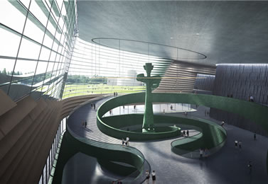 三星堆新館還包含地下一層。觀眾通過螺旋樓梯進(jìn)入負(fù)一樓以后,這里設(shè)計(jì)了游玩兒童樂園和學(xué)術(shù)報(bào)告廳。未來,孩子們可以在這里通過游戲的方式愛上考古和文物,觀眾也可以在這里聆聽到考古大咖們的學(xué)術(shù)報(bào)告。