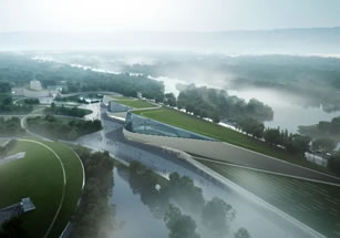 三星堆新館共三個(gè)堆體,東側(cè)兩個(gè)堆體為展陳空間,西側(cè)一個(gè)堆體為后勤庫區(qū)!毙吗^屋頂采用斜坡覆土形態(tài),建筑消隱融入環(huán)境,與一號(hào)館形體左右呼應(yīng);建筑形成三個(gè)沿中軸排列的覆土堆體,也寓意“堆列三星”。
