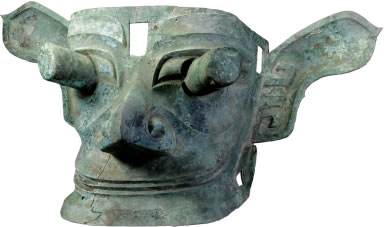 商銅縱目面具:此文物為商代的青銅器,面具呈方型,倒八字形刀眉,眉尖上挑,雙眼斜長,眼球極度夸張;耳尖部呈桃尖狀;鷹鉤鼻,口角深長上揚(yáng),似微露舌尖,作神秘微笑狀;下頜前伸;額部正中有一方孔,F(xiàn)收藏于三星堆博物館。