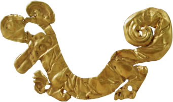 商金箔虎形飾:此文物為商代的金器,系用金箔捶拓成形,遍體壓印“目”字形的虎斑紋;㈩^昂起,張口作咆哮狀,眼部鏤空,前足伸,后足蹲,尾上卷,呈奔跑狀。金虎呈半圓形。現(xiàn)收藏于三星堆博物館。