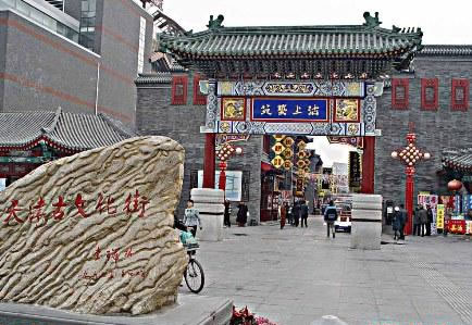 天津古文化街于一九八六年元旦建成開業(yè),整體建筑為仿清民間式建筑風(fēng)格,天后宮(媽祖廟)位于全街的中心。全街近百家店堂,有經(jīng)營(yíng)天津地方特色的楊柳青年畫的楊柳青畫社,經(jīng)營(yíng)泥人彩塑的泥人張彩塑工藝品經(jīng)營(yíng)部,有經(jīng)營(yíng)文房四寶,名人字畫的四寶堂,春在堂,有經(jīng)營(yíng)文物古玩的文物公司萃文齋門市部,還有經(jīng)營(yíng)全國(guó)各地的景泰藍(lán),雙面繡,牙玉雕,藝術(shù)陶瓷,中西樂器金銀飾品等上萬種名優(yōu)工藝品的幾十家店堂,各種商品貨真價(jià)實(shí),物美價(jià)廉,商家以質(zhì)量和信譽(yù)吸引中外游客。