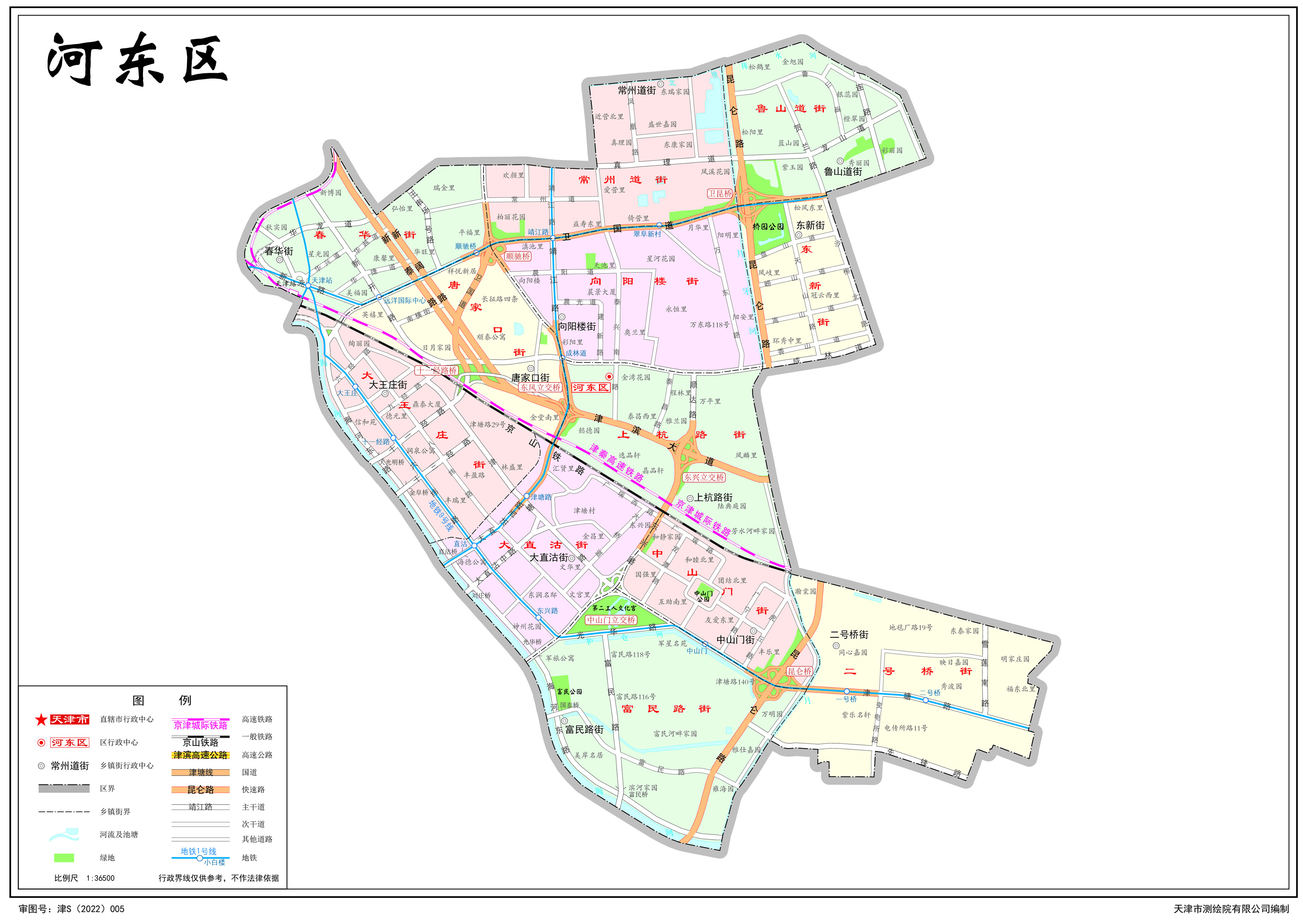 河?xùn)|區(qū)轄13個街道:大王莊街道、大直沽街道、中山門街道、富民路街道、二號橋街道、春華街道、唐家口街道、向陽樓街道、常州道街道、上杭路街道、東新街道、魯山道街道、天津鐵廠街道
