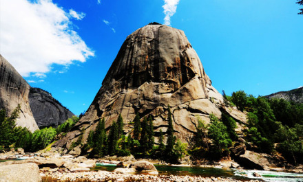 神鐘山,又名阿米爾薩拉峰,為一座如鐘似錐的花崗巖奇峰,在額河南岸平地拔起,海拔1608米,相對高差達365米,為阿爾泰山山景之最。巖壁縫上生長著白樺樹、青松和西伯利亞云杉。因巖體發(fā)育平行山坡面的同心圓層狀節(jié)理,受寒凍風化作用,沿平行坡面的節(jié)理不斷地拆離崩解垮塌,使山峰的表面既圓潤平滑,又十分陡峭,從而形成鐘狀地貌。