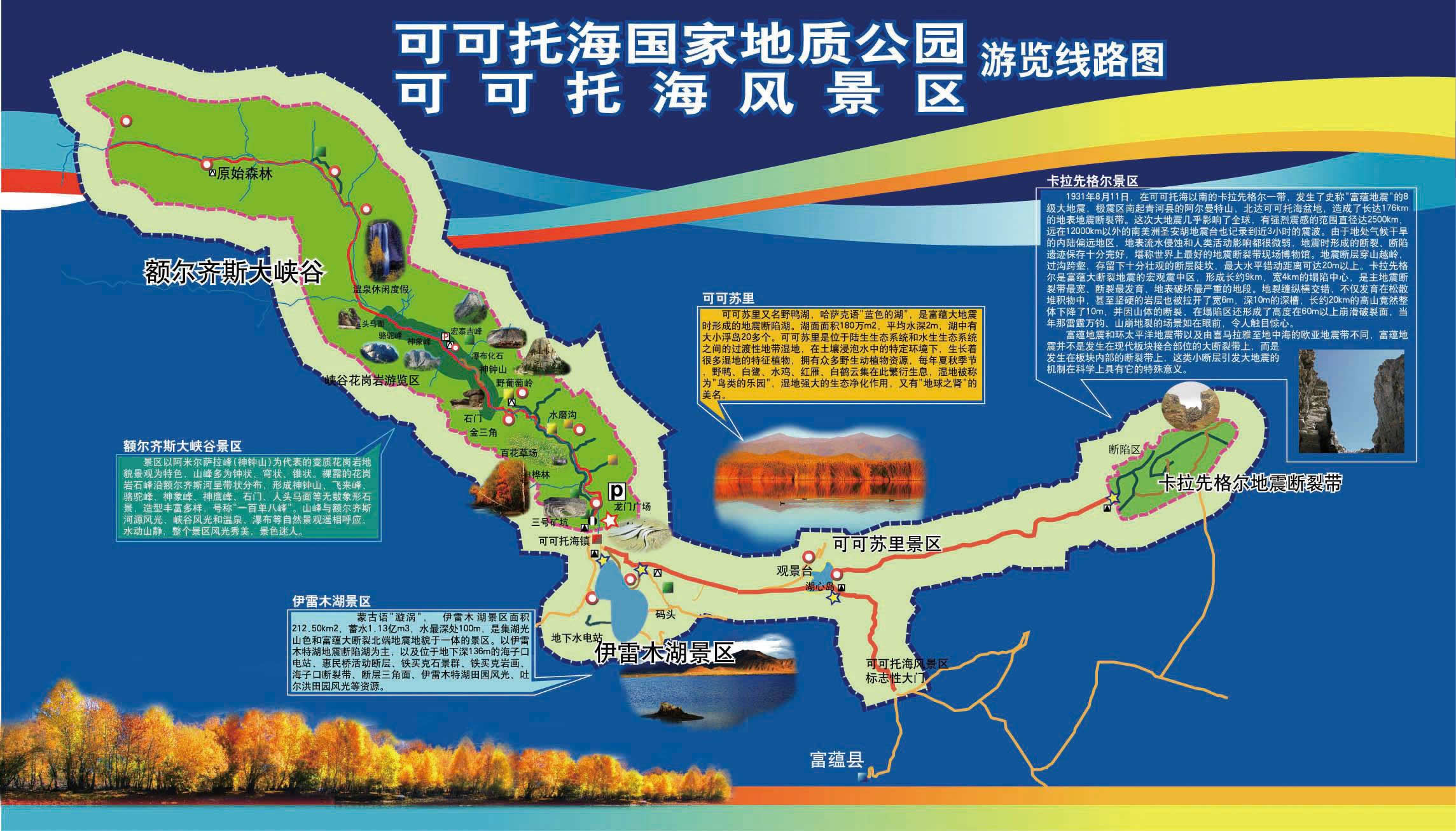 景區(qū)由額爾齊斯大峽谷、可可蘇里、伊雷木特湖、卡拉先格爾地震斷裂帶四部分組成。它以優(yōu)美的峽谷河流、山石林地、礦產(chǎn)資源、寒極湖泊和奇異的地震斷裂帶為自然景色,融地質(zhì)文化、地域特色、民族風情于一體,以觀光旅游、休閑度假、特種旅游(徒步、攝影等)、科學考察等為主要特色的大型旅游景區(qū)。
