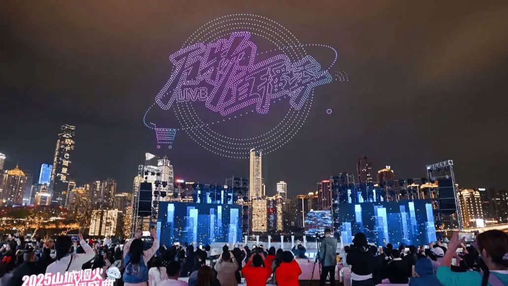 20時08分,五千架無人機騰空而起,在夜空中呈現(xiàn)“渝小e”“陳麻花”“萍姐火鍋”等定制畫面,將品牌故事升華為城市記憶。