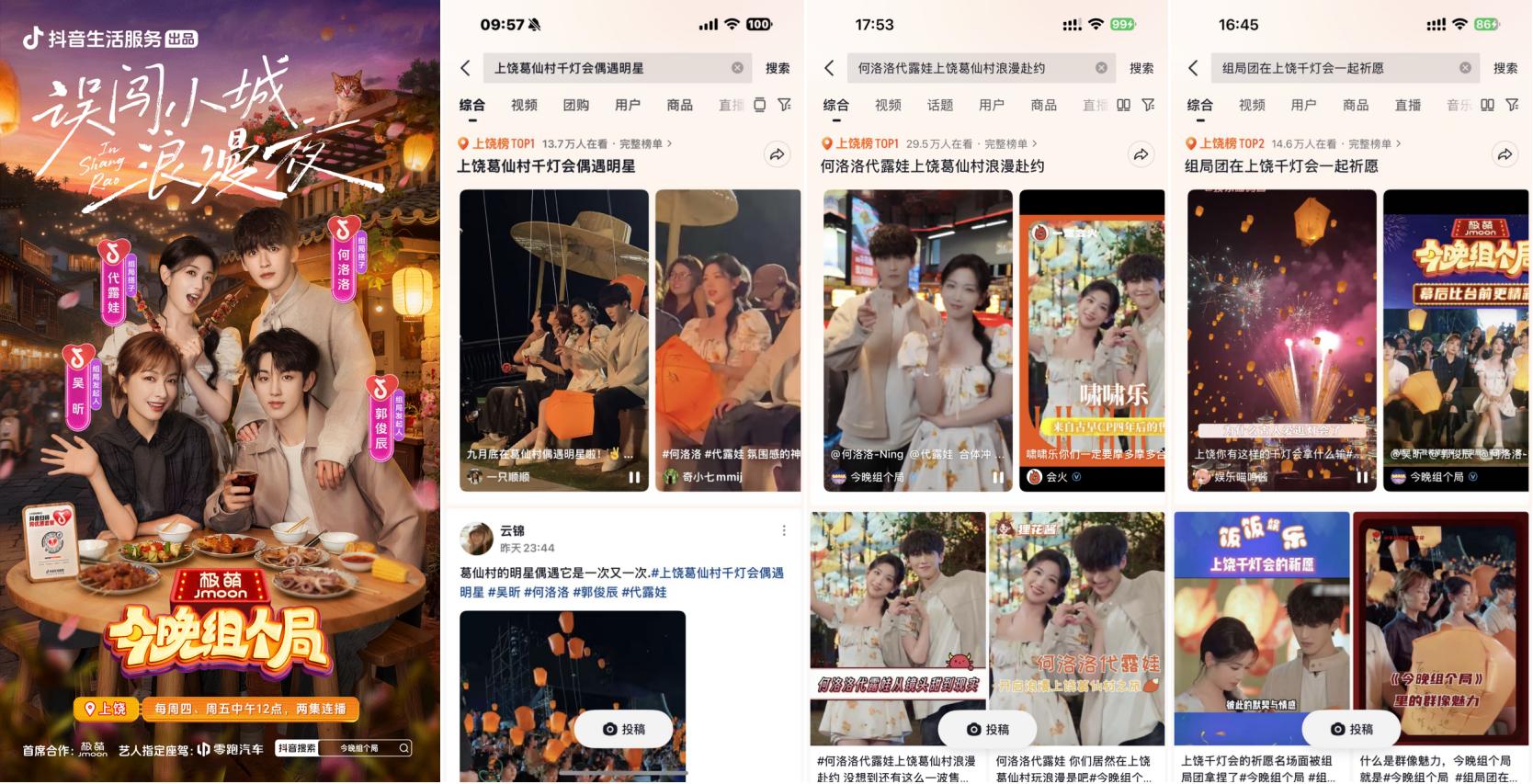 抖音牽手“秋日男友”魏哲鳴前往江西上饒葛仙村拍攝文旅宣發(fā)視頻引發(fā)廣泛關(guān)注,路透內(nèi)容#在葛仙村偶遇魏哲鳴 登上上饒同城榜TOP1;主視頻發(fā)布后,#江西的秋日封神時(shí)刻 更登頂同城榜及全國(guó)種草榜TOP6;顒(dòng)還與綜藝《今晚組個(gè)局》實(shí)現(xiàn)聯(lián)動(dòng),吳昕、代露娃、郭俊辰、何洛洛等明星演員前往上饒拍攝定制化文旅內(nèi)容,#上饒葛仙村千燈會(huì)偶遇明星 #何洛洛代露娃上饒葛仙村浪漫赴約 等路透內(nèi)容與節(jié)目看點(diǎn)登頂上饒同城榜TOP1,#組局團(tuán)在上饒千燈會(huì)一起祈愿 搶占同城榜TOP2。明星效應(yīng)有效激發(fā)用戶出行意愿,葛仙村交易額同比403%顯著增長(zhǎng),持續(xù)引爆目的地&商家出圈。