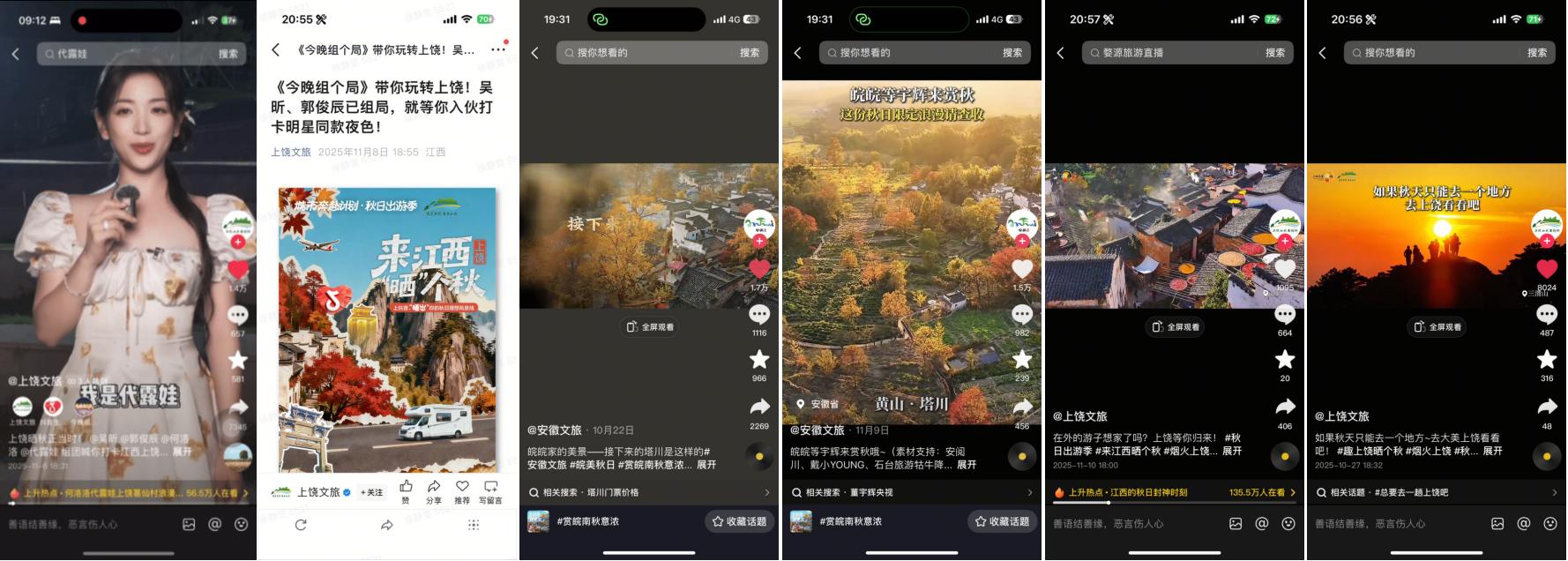 50余位跨界及垂類達(dá)人共同參與秋季種草內(nèi)容創(chuàng)作,整體曝光量突破千萬(wàn)級(jí)別,覆蓋江西上饒、安徽黃山15家重點(diǎn)頭部商家,以多元化的內(nèi)容視角與持續(xù)的內(nèi)容輸出,形成從點(diǎn)到面的內(nèi)容爆發(fā)態(tài)勢(shì),推動(dòng)江西#婺源曬秋的味道藏不住了 、安徽#潛入徽州的秋日畫卷 等城市賞秋熱點(diǎn)上榜,讓江西與安徽兩地秋景,以更生動(dòng)的方式呈現(xiàn)在用戶面前。