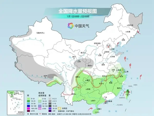 除了降溫,冷空氣還將帶來(lái)大范圍雨雪天氣。隨著冷空氣南下與暖濕氣流交匯,今天至2026年1月1日,中東部將現(xiàn)大范圍雨雪,陜西中南部、山西南部、河南西部、湖北西部部分高海拔地區(qū)有大雪或暴雪,最強(qiáng)降雪時(shí)段為2025年12月31日至2026年1月1日早晨。