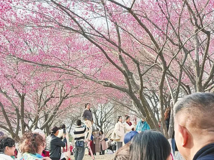 記者踏上緩坡,越往坡頂走,人氣越旺,花香愈濃,蜜蜂翻飛于花枝之間。這片占地約8000平方米的坡地上,栽植著紅梅、宮粉梅、綠萼梅、白梅等4個品種共500余株梅樹。坡頂北側(cè)光照充足,上百株紅梅與宮粉梅已競相開放,匯成一片絢爛的“粉色云霞”,與南側(cè)尚在蓄蕾、點點白梅吐蕊的靜謐景象相映成趣。