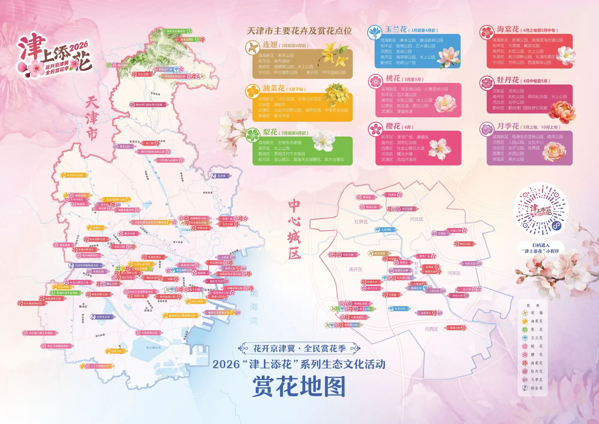 本次天津賞花活動覆蓋全域,配套發(fā)布的賞花電子地圖成為市民出游的實用指南,地圖清晰標注各點位花期、交通等關鍵信息,方便大家定制專屬賞花路線。相較于往年,今年賞花點位從100個增至129個,不僅囊括傳統(tǒng)賞花勝景,還融入綠屏、古樹、非遺、觀鳥等元素,實現(xiàn)“四季有花、全域皆景”,白天賞繁花、夜晚看夜景的全時段觀賞體驗讓春日游玩更豐富。