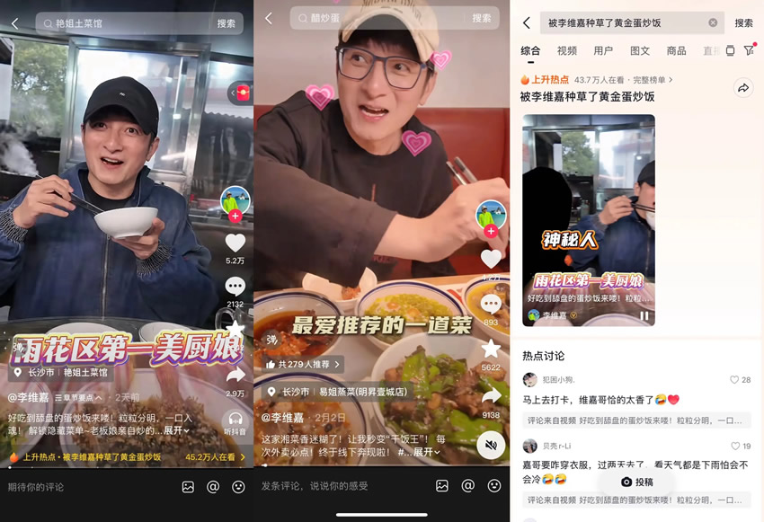 除了政務(wù)聯(lián)動(dòng),明星探店更是為湘菜引流添柴加火,讓長沙味道徹底出圈。本土熟面孔李維嘉強(qiáng)勢加盟,帶來系列探店內(nèi)容,用接地氣的講解、沉浸式的品嘗,帶大家走進(jìn)長沙街巷深處的兩處寶藏湘菜館——艷姐土菜館、易姐蒸菜,解鎖藏在煙火里的地道風(fēng)味,每一條視頻都充滿煙火氣與趣味性,精準(zhǔn)戳中網(wǎng)友味蕾,無數(shù)網(wǎng)友被李維嘉種草了黃金蛋炒飯。