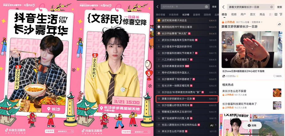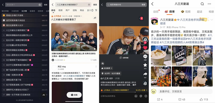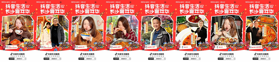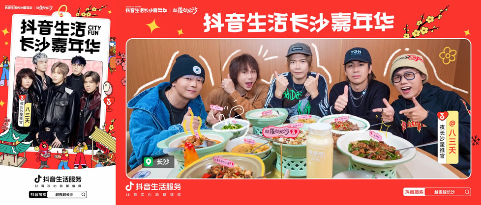 更值得一提的是,憑借城市強(qiáng)力宣傳資源,八三夭團(tuán)隊(duì)首次與抖音生活服務(wù)達(dá)成合作,借著樂隊(duì)新發(fā)專輯的熱度,打造了一支趣味十足的湘菜探店視頻。視頻中,八三夭成員沉浸式品嘗長沙湘菜,被地道風(fēng)味狠狠圈粉,相關(guān)內(nèi)容不僅鋪滿長沙熱門湘菜綠草地重點(diǎn)商圈的抖音物料,更成功上榜長沙城市熱點(diǎn)#八三夭被長沙湘菜香到了,讓湘菜味道借著明星熱度,飄進(jìn)了萬家燈火中。