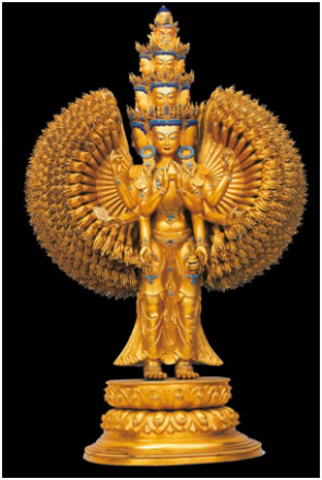 西藏本土制造的宗教文物,以金銅造像最著名。羅布林卡興建之初,七世達賴為給剛建好的宮殿佛堂添裝佛像及佛教用具,曾在布達拉宮腳下建立了一所名為“雪堆白”的造像場,匯集了藏區(qū)內(nèi)幾百名能工巧匠,在這里精心打造各種佛像器物,以滿足拉薩及周邊地區(qū)寺院的需求。羅布林卡從初建到最后完善,每座佛堂里的大小佛像都被指定由“雪堆白”工匠量身定做打造。除此之外,園內(nèi)很多佛龕、宗教用具、金頂屋檐、門楣雕飾等,也都出自“雪堆白”工匠之手!把┒寻住痹煜裉攸c是制作精細、比例勻稱、色彩鮮明艷麗,佛像上的鍍金厚重,鍍金面光潔度高,佛冠、耳墜、臂釧、手鐲、飄帶等飾物,一律用綠松石鑲嵌。這些明顯特征,說明18世紀(jì)中葉以后,西藏本土佛像打造技術(shù)已步入了獨立發(fā)展的成熟階段。