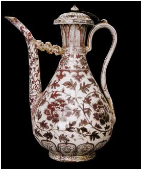明洪武時期(公元1386年--1398年)贈送的釉里紅牡丹紋執(zhí)壺,高37cm,足徑11cm,這是一件造型端莊美觀大方、繪工精細、十分鮮見的瓷器。由于釉里紅瓷器燒制難度大,成品率低,在現(xiàn)今中國內(nèi)地保存數(shù)量已很少,而在西藏能完好保存這件瓷品長達600多年,實屬難得。
