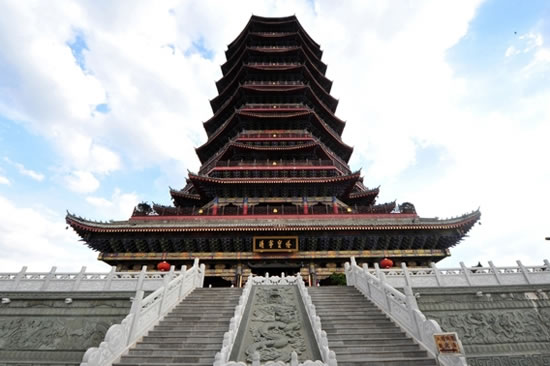 靖寧寶塔位于寥廓山頂,屬曲靖城市最高點的地標性建筑。靖寧寶塔占地9997平方米(13畝)、總投資7000萬元,分為主塔建設和室外環(huán)境配套建設兩部分。主題建筑面積7427平方米,建筑立面為明清仿古式樓閣造型,主塔為9層,底層為四邊形,二層以上呈八邊形布置,每層收分60厘米,塔總高81.6米,塔主題由塔基、塔身、塔剎三部分組成。