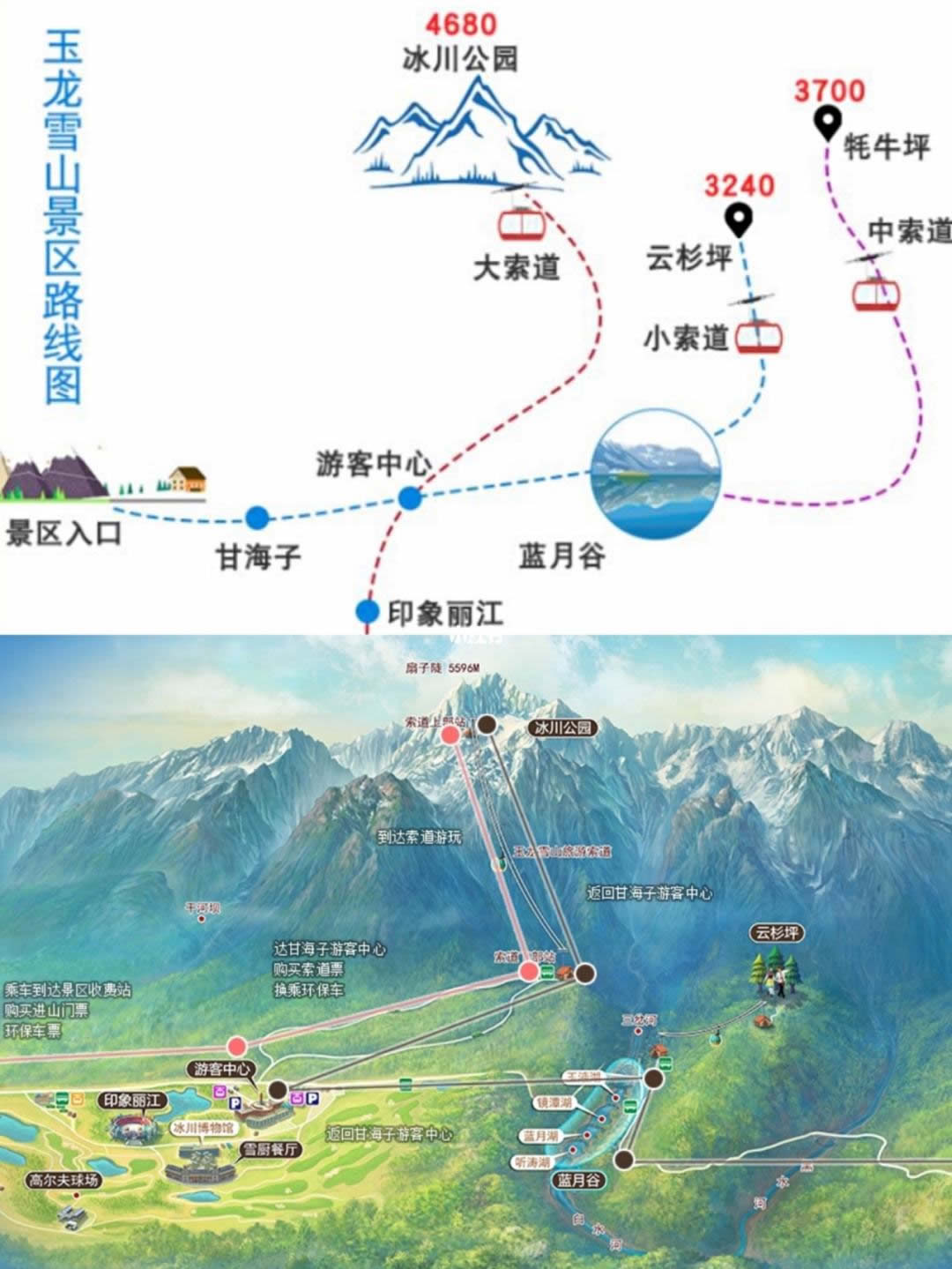 玉龍雪山冰川公園是觀賞“白水一號”現(xiàn)代冰川的最佳位置,游覽冰川公園可乘坐玉龍雪山旅游索道,該索道是通往冰川公園,涉足皚皚雪域,游覽“綠雪奇峰”的唯一通道,從海拔3356米處提升至玉龍雪山主峰扇子陡正下方海拔4506米處,索道全長2911米,垂直高差1150米。沿途可觀賞垂直帶自然景觀,遠(yuǎn)眺甘海子、白水河、牦牛坪、云杉坪等景點(diǎn)。