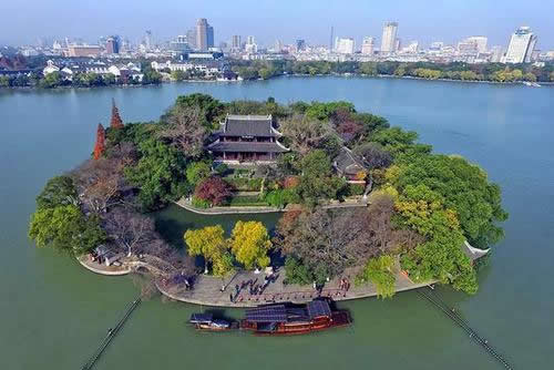 湖心島位于南湖中心,全島面積17畝。明嘉靖二十七年(公元1548年)嘉興知府趙瀛組織疏浚城河,將淤泥壘土成島,次年移建煙雨樓于島上。清以后又相繼建建成清暉堂、孤云簃、小蓬萊、來(lái)許亭、鑒亭、寶梅亭、東和西御碑亭、訪蹤亭等建筑,形成了以煙雨樓為主體的古園林建筑群,亭臺(tái)樓閣、假山回廊、古樹(shù)碑刻,錯(cuò)落有致,是典型的江南園林。