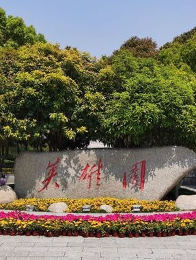 入口:入口道路寬十米,采用花崗石塊鋪設(shè),入口處立有一塊黃石,上面雕刻“英雄園”三個(gè)毛體大字,周圍為休憩花壇,花壇兩側(cè)種有龍柏。