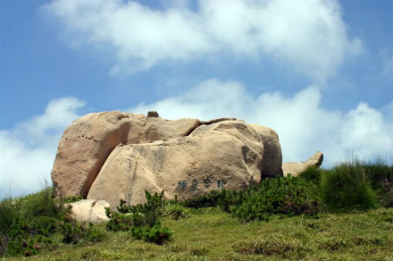 天然草坪西側(cè)山上,有一巨崖,橫臥地上,像一頭俯伏的雄獅、從北看,又似伸長鼻子的大象。東側(cè)山上巖群中,還有一只大象的頭、長鼻子向下延伸,一雙眼睛向游客凝視。鄰近石像一頭海龜,翹首藍(lán)天,似在仰望著翱翔的鷗鳥。
