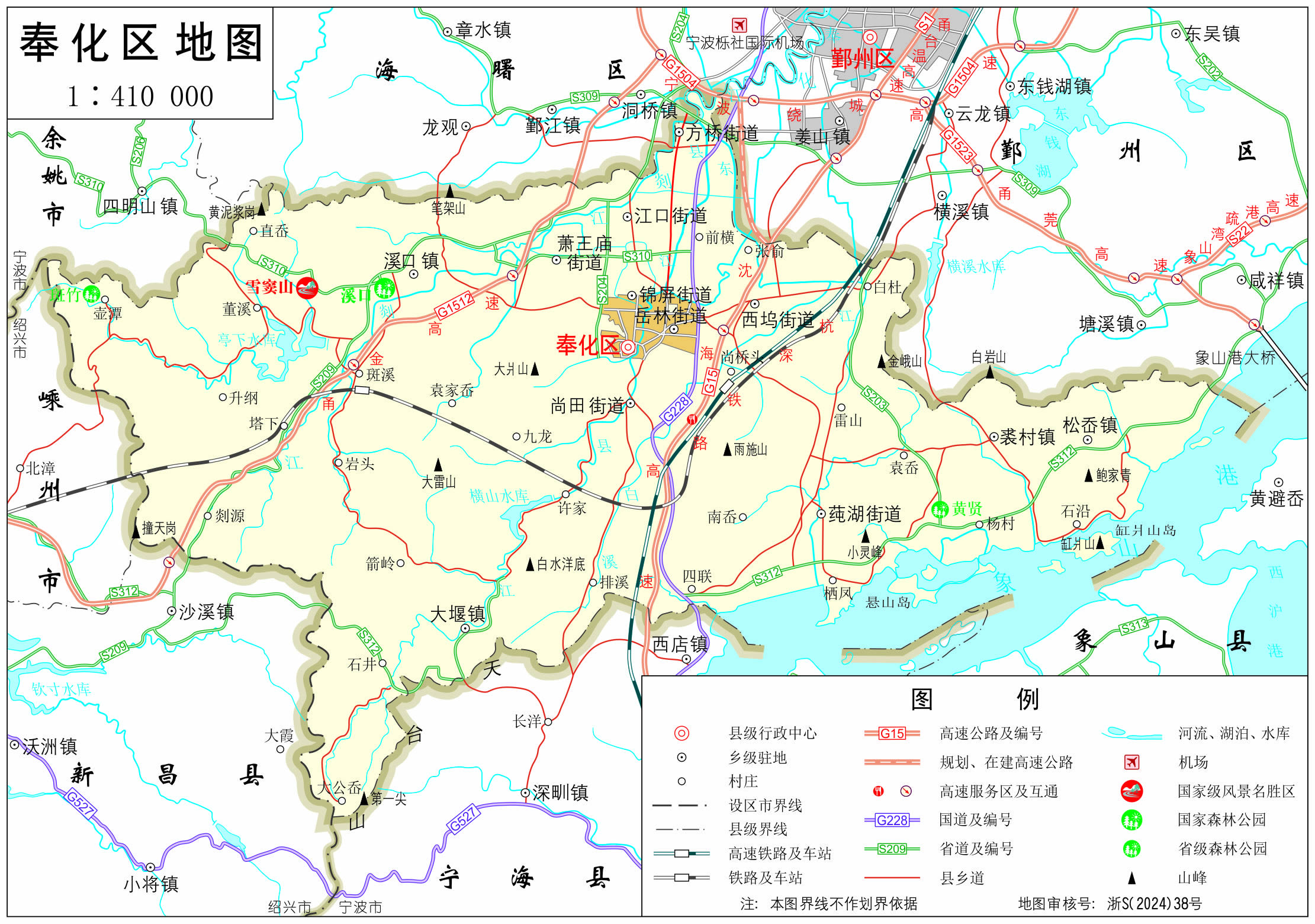 鎮(zhèn):溪口鎮(zhèn)、尚田鎮(zhèn)、莼湖鎮(zhèn)、裘村鎮(zhèn)、大堰鎮(zhèn)、松岙鎮(zhèn)