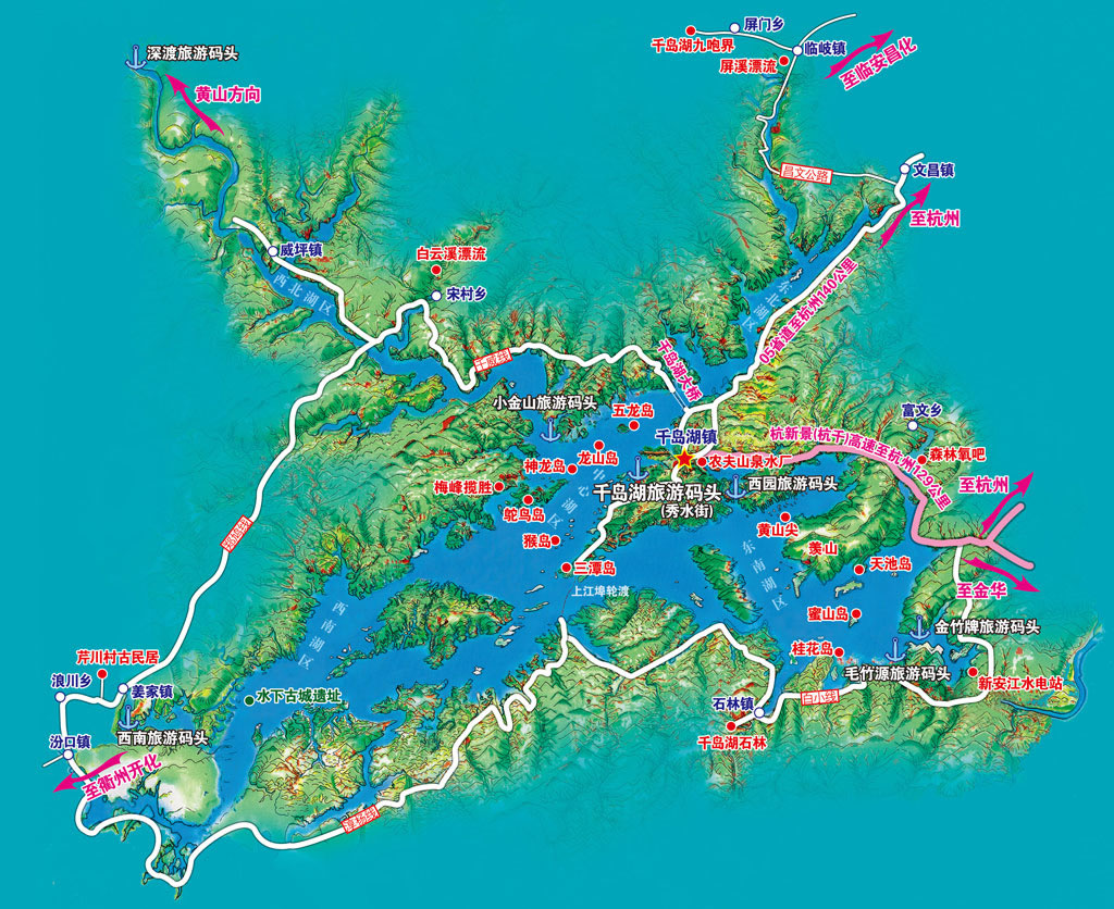 千島湖與桐廬瑤林仙境、嚴(yán)子陵釣臺(tái),建德大慈巖,蘭溪諸葛八卦村,龍游石窟,安徽西遞、宏村等景點(diǎn)聯(lián)成一體,體,吸引眾多的游客。千島湖所在的淳安縣北接臨安縣、南接常山縣、西南與開(kāi)化縣、衢州市為鄰,東南與桐廬和建德二縣市接壤,西北與安徽省交界。